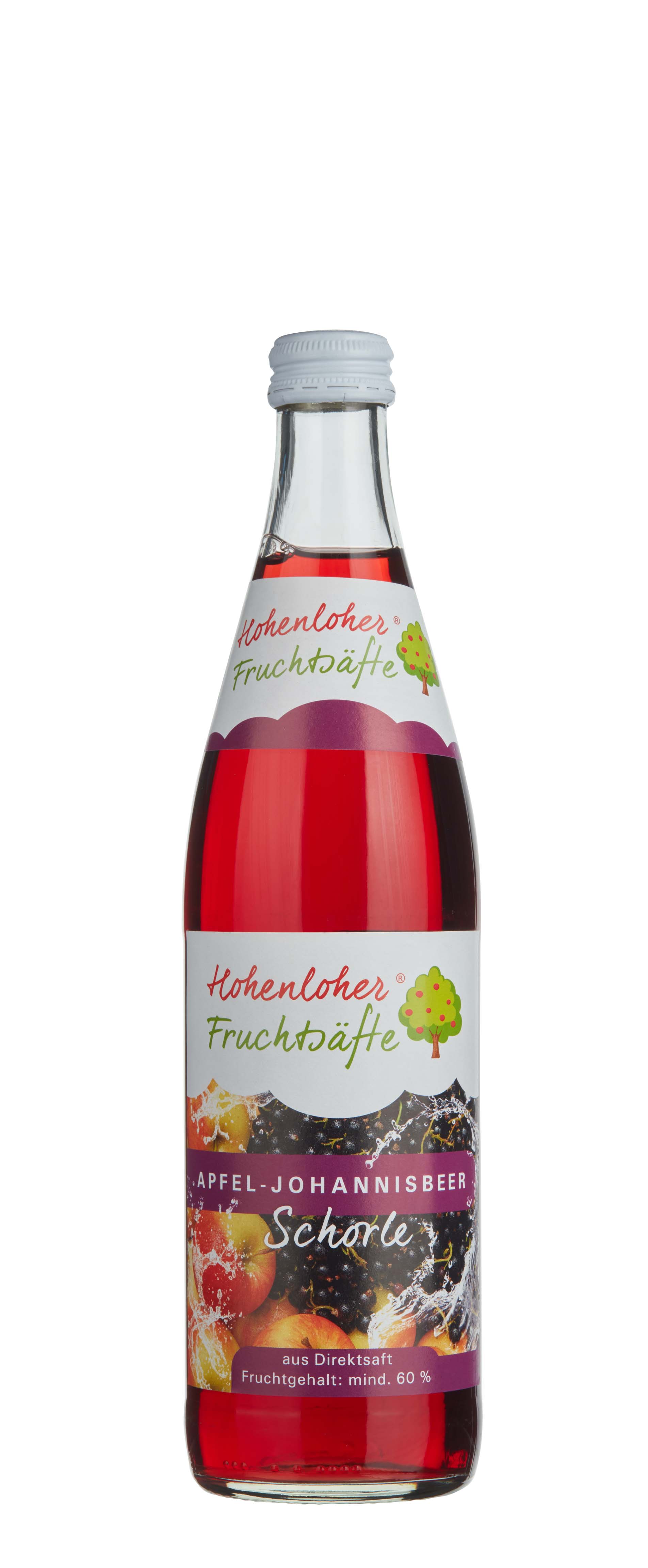 Hohenloher Apfel-Johannisbeer-Schorle ist ein aromatisch-fruchtiger Durstlöscher. Der körperreiche Saft der schwarzen Johannisbeere harmoniert in besonderer Weise mit dem süßen Apfelsaft sonnenverwöhnter Obstgärten. Durch diese fein abgestimmte Mischung ist der Einsatz von Zucker oder anderen Zusatzstoffen gemäß der Philosophie unserer Mosterei nicht erforderlich.